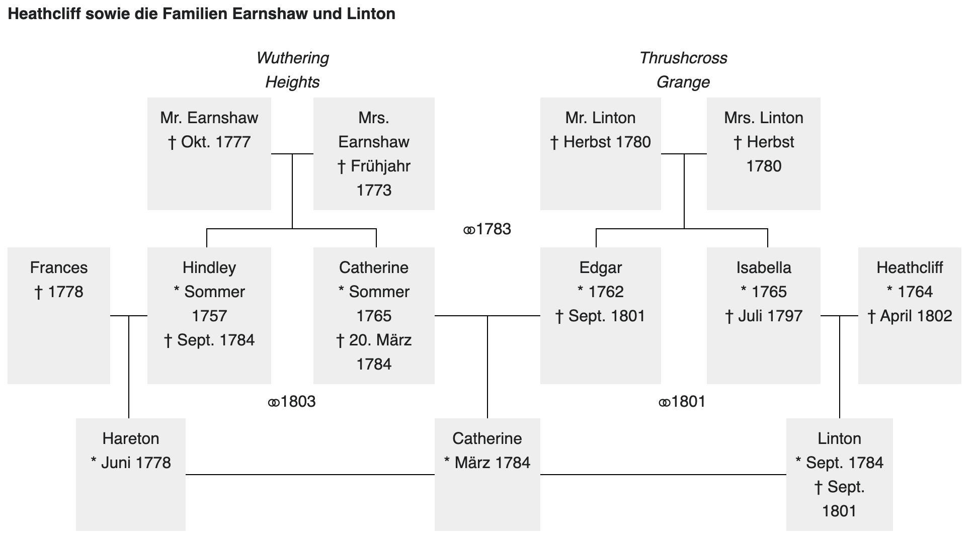 Genealogie Heathcliff sowie die Familien Earnshaw und Linton zum besseren Verständnis der Protagonisten aus Sturmhöhe – Wikipedia: